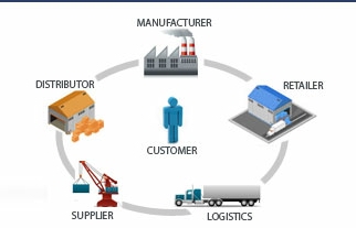 सप्लाई चैन मैनेजमेंट की प्रक्रिया, उत्पादक (manufacturer) से थोक विक्रेता (wholesaler), थोक विक्रेता से फुटकर विक्रेता (retailer) तथा फुटकर विक्रेता से ग्राहक तक की है.