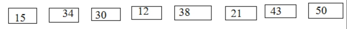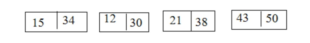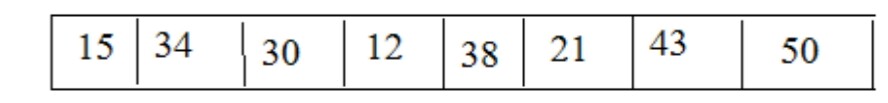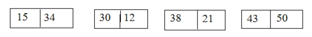 सबसे पहले 15 और 34 को compare करते है परन्तु ये तो पहले से ही sorted है. 30 और 12 को compare किया जाता है क्योंकि 30, 12 से बड़ा है इसलिए 12 को 30 से पहले लिखेंगे. 38 और 21 को compare करेंगे इसमें 21 को 38 से पहले लिखेंगे. 43 और 50 पहले से sorted है.