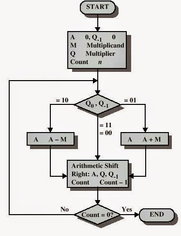 I). जब दो bits Qn and Qn + 1 00 या 11 हैं, तब हम AC के लिए arithmetic shift right operation (ashr) को परफॉर्म करते हैं और Qn और Qn + 1 के बिट्स 1 से increment हो जाते हैं.